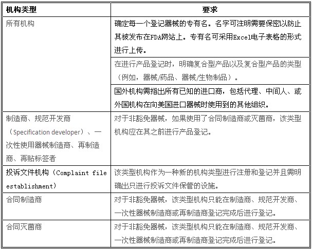 除此之外,根據(jù)MDUFA Ⅲ的規(guī)定,所有醫(yī)療器械機構(gòu),無論機構(gòu)類型或從事的商業(yè)活動如何,從2012年10月1日開始,在進行年度注冊時都必須繳納2,575美金的注冊費,小型企業(yè)將無豁免和減免)。FDA還根據(jù)不同的機構(gòu)類型制定了不同的注冊和產(chǎn)品登記要求。由于FDASIA的正式生效,注冊和登記要求也做出了相應的修改。對于需要進行機構(gòu)注冊和產(chǎn)品登記的美國國外醫(yī)療器械機構(gòu),F(xiàn)DA做出的最新要求如下:
